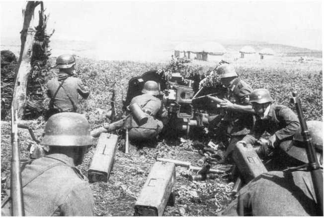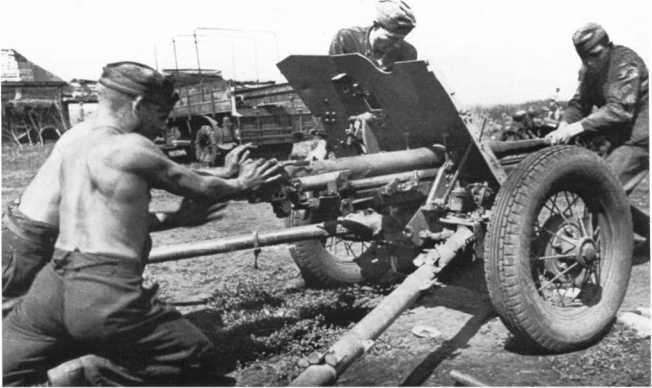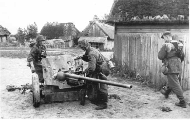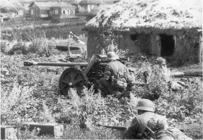 Расчет 50-мм противотанковой пушки Pak 38 поддерживает свою пехоту во время боя за деревню. Июль 1942 года, район Цимлянской. На стволе орудия видны шесть белых колец – число подбитых расчетом советских танков (АСКМ).