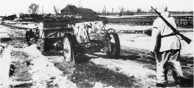 Трофейная французская танкетка Renault UE буксирует 76,2-мм противотанковое орудие Pak 36 (r). Советско-германский фронт, весна 1943 года. Пушка имеет зимний камуфляж (АСКМ).