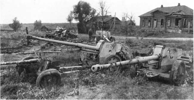 Трофейные советские 45-мм противотанковые пушки образца 1934 и 1937 годов (слева и справа соответственно). Лето 1943 года. В вермахте эти орудия использовались под обозначением Pak 184 (r) (АСКМ).