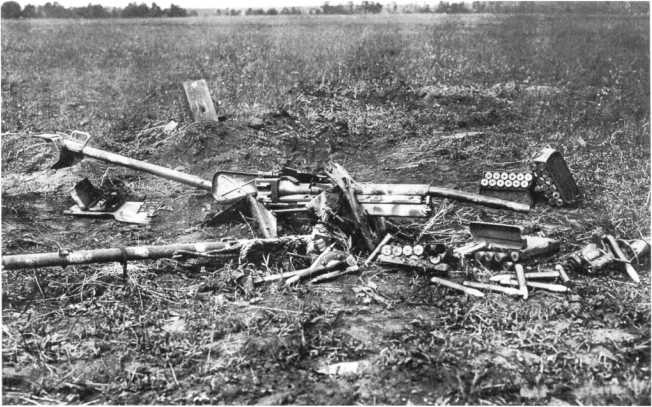 37-мм противотанковое орудие Pak 35/36, раздавленное советскими танками. Центральный фронт, июль 1943 года, юго-восточнее деревни Подсобурово. Хорошо видны металлические ящики на 12 37-мм выстрелов, на стволе и противооткатнике различимы остатки камуфляжа (АСКМ).
