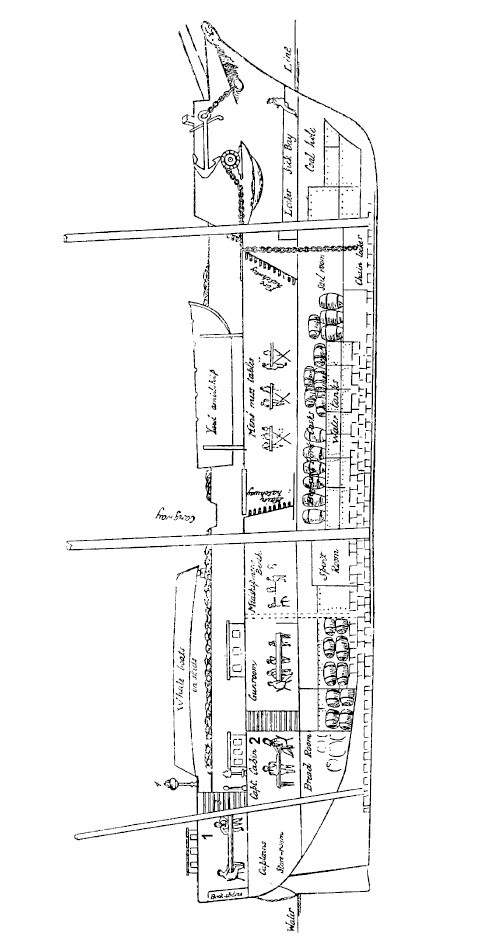 Рис. 2.1. Корабль Его Величества Beagle в разрезе. Помещения, в которых Дарвин провел большую часть своего корабельного времени: 1 – кормовая каюта, 2 – капитанская каюта