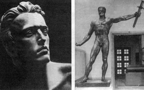 Скульптор Брекер создавал прекрасный возвышенный образ безупречного мужского тела, который был созвучен гомоэротическим мечтам Гитлера. Его работа «Вызов» (слева) запечатлела мгновение преображения, когда воин осознает себя борцом за рейх, доблести мужского союза и понимает, что готов на жертву. Именно этого Гитлер требовал от каждого немецкого мужчины.
