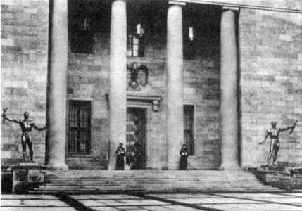 Дворец Гитлера стал своего рода храмом новой арийской религии. У главного входа стояли две огромные обнаженные мужские статуи работы Арно Брекера: «Партия» (выше она в экспозиции Большой немецкой художественной выставки) и «Вермахт», которые должны были символически преграждать вход всему чужеродному и нечистому.