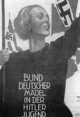 Бросаются в глаза общность и различие в образах женщин, созданных французскими революционерами и нацистами. Если Марианна на картине Делакруа «Свобода, ведущая народ» (вверху) водружает знамя на баррикаде, то немецкая девушка с плаката Людвига Хольвайна (1933), призывающего вступить в Союз германских девушек (справа), держит его в руке. Марианна устремлена вперед, немка же замерла в более пассивной, выжидающей позе, она не стремится к самостоятельному действию, а как бы слушает, что ей скажет фюрер. Он укажет ей направление, по которому она дисциплинированно и без возражений продолжит свой путь. У немецкой девушки не может быть винтовки в руке: почти до конца войны нацисты не желали давать оружие женщинам. Только перед своей гибелью Гитлер отменил этот запрет и разрешил вооружить женщин.