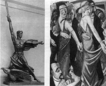 Адольф Гитлер хотел противопоставить чистое германское искусство стилю вырождения. Для этого в 1937году одновременно с Большой немецкой художественной выставкой во Дворце германского искусства, где были выставлены работы Арно Брекера (сверху слева «Выступление», сверху справа «Смелость»), пропагандировавшие эротику, лишенную желания продолжения рода, и образ прекрасного мужчины, противостоящего гетеросексуальному искушению, в Шпандау была открыта выставка «Дегенеративное искусство». Выступая на церемонии открытия, Гитлер сказал: «Что они хотят донести до зрителя? Что они изображают? Уродов, кретинов и женщин, вызывающих только отвращение, мужчин, которые больше похожи на зверей, чем на людей, детей, которые, родившись в реальном мире, стали бы знаком кары небесной». Кроме работ Брекера, в его представления о прекрасном вписывался и китч с гомосексуальным флером, примером чему служит скульптура Адольфа Вагнера «Гений победы» (внизу слева).