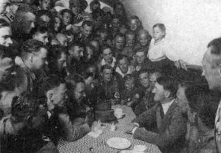 В толпе молодых мужчин Адольф Гитлер преображался и просто расцветал. Еще в «эпоху борьбы» его влекла теснота пивных, где юноши сидели и стояли вплотную к нему. На снимке, сделанном в 1930 году, фюрер наслаждается обществом молодых членов партии в казино «Коричневого дома» в Мюнхене.
