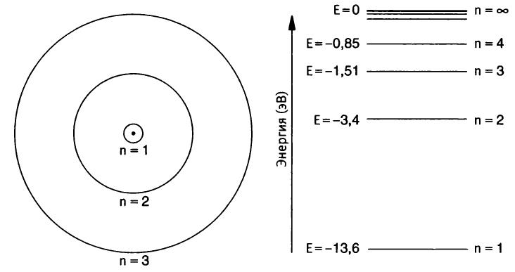 Рис. 6. Несколько стационарных состояний и соответствующие им энергетические уровни атома водорода (рисунок не в масштабе)