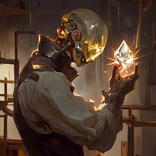 Внутри лавки не оказывается других посетителей, что нам на руку, поэтому остается сразу подойти к прилавку, за которым находится фигура этого Афинна. Вокруг светло из-за больших ламп, поэтому легко можно рассмотреть мехалита, который в свою очередь очень внимательно смотрит на лучистый магический кристалл в руке. Свечение отражается от металлической маски цвета золота, но я обращаю внимание на вполне человеческое ухо, что довольно странно выглядит в окружении механизмов.