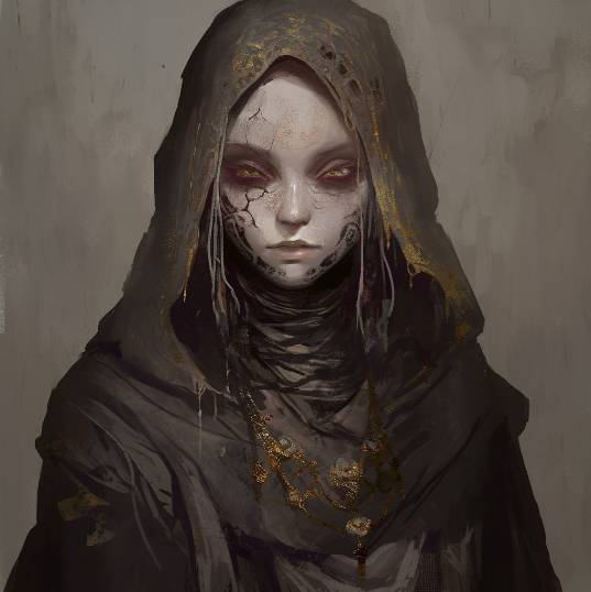 Точно вижу, что это не человек или эльф. Это вообще не живое существо, и похоже оно на Ширада Золотоносного и Фирада Смарагдового. Под хламидой у гостьи неживое тело, как будто составленное из черного костного материала.