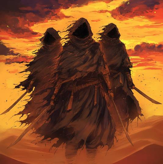 А на закате мы увидели их. Слева и справа в пустыне возникают человеческие фигуры в темных плащах и капюшонах. Они держат в руках ветхие клинки и как будто являются миражами, но угрозу я чувствую реальную. На фоне проклятья пустыни они выглядят как еще более темные пятна.
