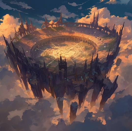 Примерно круглая арена с большим количеством рядов парит в воздухе с уходящими в облака каменными столбами. Кажется, что она стоит на этих скальных сваях до самой земли, но это просто невозможно с точки зрения физики, я уверен, что это визуальная иллюзия, и на самом деле арена летает в воздухе. Конечно, последнее тоже невозможно с точки зрения естественных наук, но открывшееся нам сооружение источает из себя большие объемы арканы, которая закручивается причудливыми узорами.