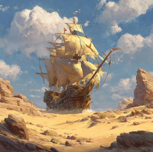 Если не считать того, что корабль плывет по пустыне, выглядит картина очень знакомо. Остов у транспорта деревянный, а белые паруса раздуваются ветром, причем, не только обычным. Сейчас вокруг штиль, но паруса натянуты, что может указывать на совсем другую толкающую вперед силу. Раскрываю психическое око шире и вижу, как вокруг меняется мир.