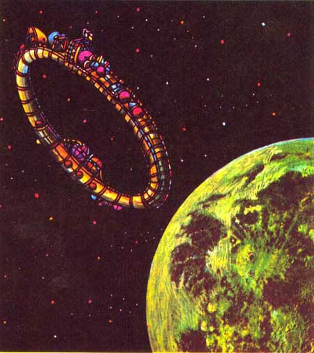 Каким будет такой космический корабль? Мы его представляем себе в виде кольца с диаметром порядка 200 метров, вращающегося в одной плоскости наподобие автомобильного колеса. Внутри такой «покрышки» находились бы помещения для людей, научная аппаратура, техническое оборудование и быть может помещения для растений.