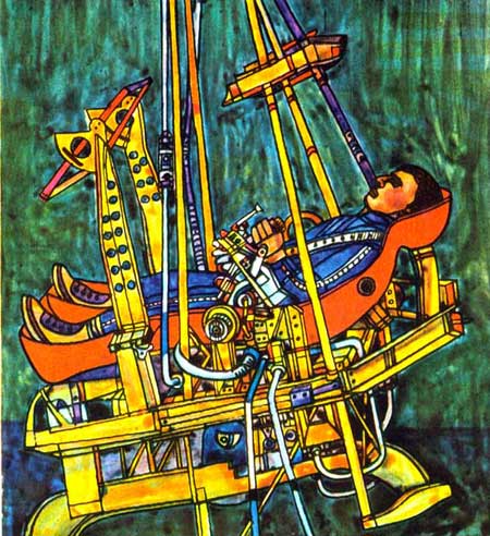 Плечо центрифуги, на конце которого находится кабина для летчика, весьма длинное (до 17 метров), поэтому во время вращения возникает большая центробежная сила и столь же большие перегрузки. Когда центрифуга начнет вращаться со скоростью 100 оборотов в минуту, космонавт, сидящий в кабине, переживает немалые трудности. Все тело его прижимается к креслу, глаза застилает кровавый туман, в голове – словно молоты стучат по наковальне, в ушах – невыносимая боль, губы искривляет гримаса. Когда все это начинает превышать предел стойкости человека, космонавт может нажать кнопку, после чего обороты уменьшатся. Но в этих условиях совсем нелегко сделать даже обыкновенное усилие, требуемое для того, чтобы нажать кнопку. Испытания на центрифугах, весьма широко поставленные в Соединенных Штатах Америки и в Советском Союзе, дали много нового и позволили изучить влияние перегрузок на человеческий организм. Установлено, что стойкость человека к перегрузкам во многом зависит от положения его тела по отношению к направлению воздействия сил. Оказалось, что находясь в полулежачем положении, с ногами, слегка согнутыми в коленях, и лицом по направлению полета, человек может выдержать большую перегрузку, чем в другом положении корпуса. Таким образом, во время старта, космонавт должен лежать по возможности на спине, а во время приземления, или при посадке на поверхность другой планеты, космонавт должен находиться лицом к направлению места посадки.