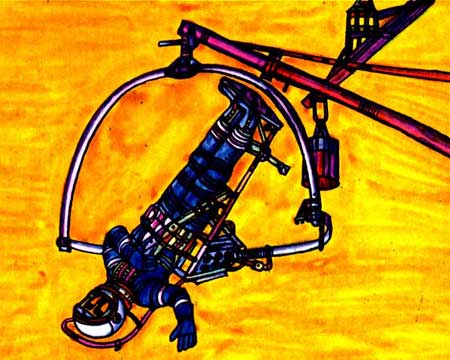 Но это еще далеко не все в области тренировки чувства равновесия. Конструкторы совместно с физиологами придумали еще одно сложное устройство. Одним из них является МАСТИФ, конструкция из стальных труб, похожая по форме на шар, вращающийся на оси. Внутри ее находится еще одна такая же конструкция, которая вращается на другой оси; внутри этой конструкции находится еще одна, вращающаяся на третьей оси, и к ней подвешено кресло испытуемого кандидата. Таким образом вся конструкция этого «чертова колеса» может вращаться одновременно в трех плоскостях. Когда вся установка приходит в движение, кандидат чувствует себя так, будто он не только кувыркается в воздухе, но и производит одновременно сто других движений. При этом ему отнюдь нельзя терять ориентировку и, как предусматривает программа испытаний, необходимо несколько раз дать сигнал остановки движения в точно определенном положении по отношению к окружающим предметам.