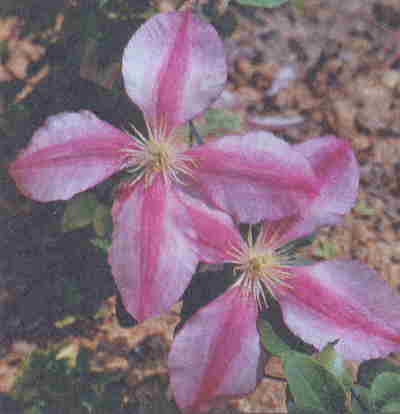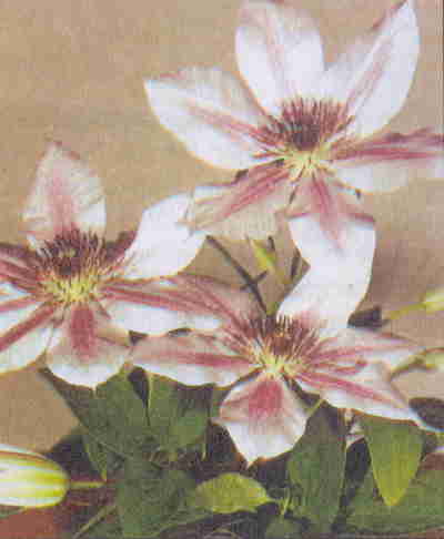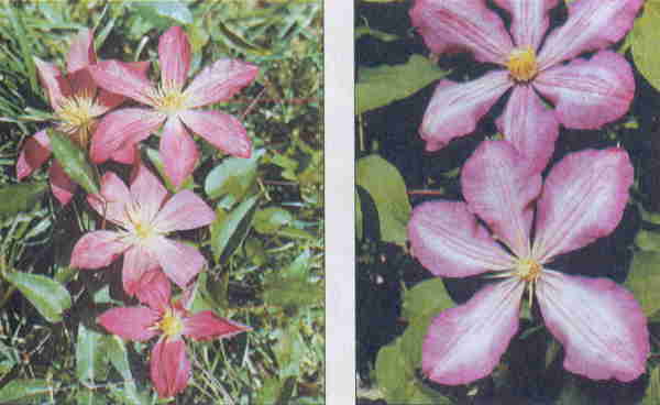 Цветки раскрытые, звездообразные, 16–20 см диам. Чшл. 6–8, они светло-голубовато-розовые с красно-малиновой полосой по центру, сильно выгорают. Пыльники красновато-пурпурные. Кустарниковая лиана длиной 2,5–3,5 м. Листья тройчатые, реже простые.