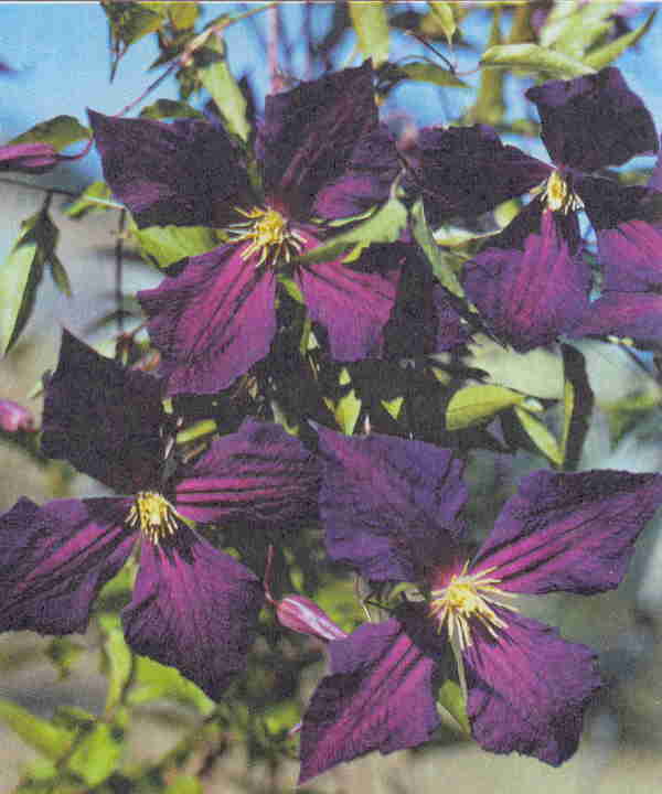 Цветки раскрытые, слегка поникающие, 12 (10–4) см диам., чаще собраны по три. Чшл. 5, реже 4, они густо-фиолетовые, не выгорают.