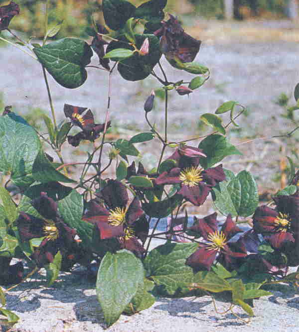 Цветки раскрытые, 10–12 см диам. Чшл. 5–6, реже 4, они очень тёмные, фиолетово-чёрные, при отцветании несколько скручиваются. Пыльники окрашены. Кустарниковая лиана длиной до 4 м. Листья сложные, в основном из 5 удлинённых листочков.