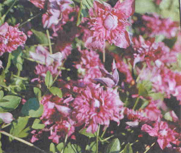 Цветки махровые, распускаются постепенно, некрупные, 6–9 см диам.; сохраняют декоративный вид на растении до 25 дней. Чшл. много, они дымчато-фиолетовые (красно-пурпурные), после цветения не опадают. Тычинок и пестиков нет. Кустарниковая лиана длиной 2,5–3,5 м. Листья сложные, из 7, редко 5 плотных листочков.