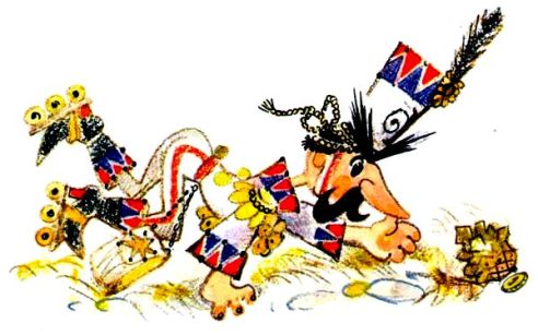 Перепуганный воробей метался по залу и поджигал то бумажные фонарики, украшавшие потолок, то разноцветные ленты и флаги, пока не догадался окунуться в тарелку с черепашьим супом. Трут зашипел и погас. Ручка у корзиночки перегорела, и, освободившись от ноши, воробей выпорхнул в окно и улетел.