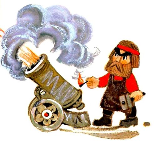 Сначала затея Петрушки кузнецу не очень понравилась. Он долго отговаривал мальчика, но тот стоял на своем, и кузнец Игнат сдался. Он попросил ткача Сидора, трубочиста Яшу перенести пушку в огород Терентия.