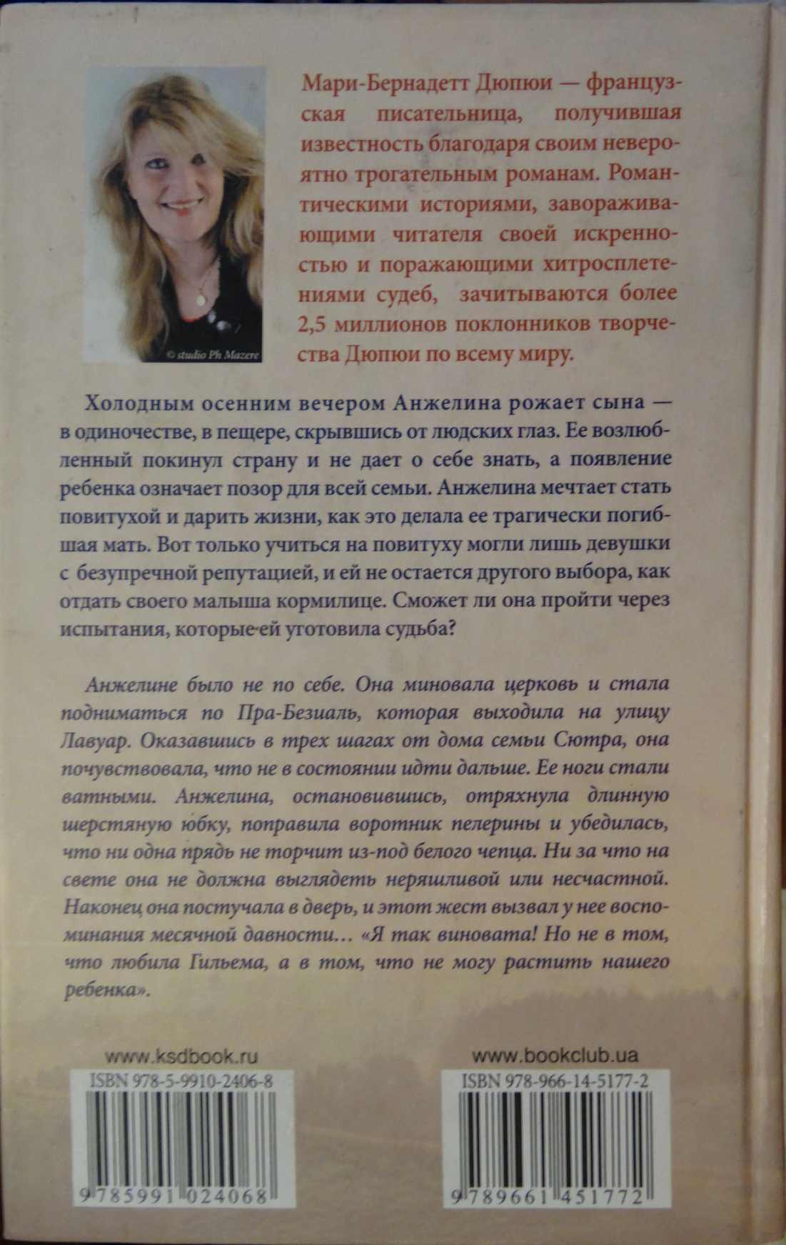 Мари-Бернадетт Дюпюи – французская писательница, получившая известность благодаря своим невероятно трогательным романам. Романтическими историями, завораживающими читателя своей искренностью и поражающими хитросплетениями судеб, зачитываются более 2,5 миллионов поклонников творчества Дюпюи по всему миру.
