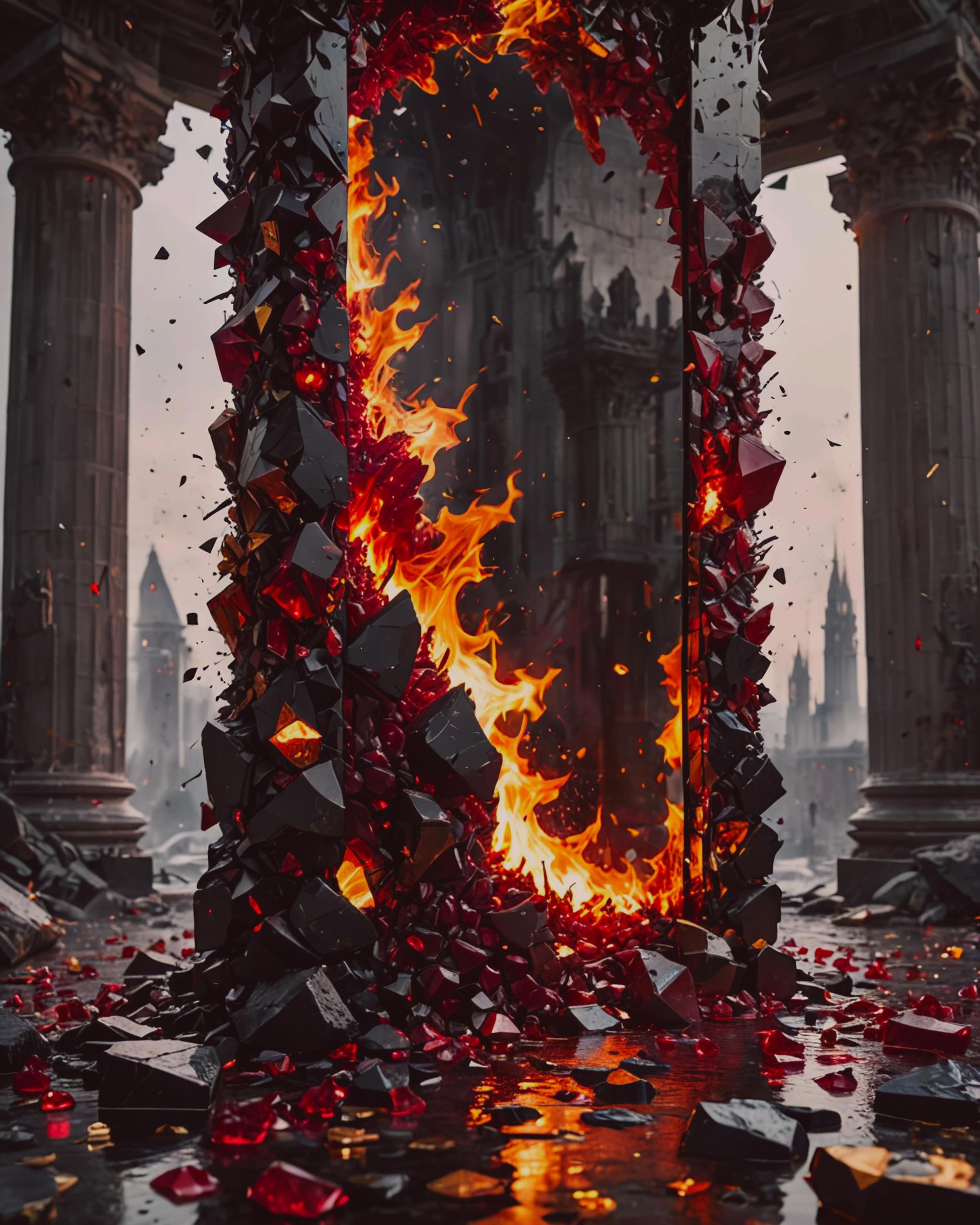 Движение. Черные базальтовые осколки извращенных форм разных размеров на дикой скорости вращались вокруг красно-золотого столба.