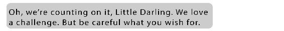 «О, мы на это рассчитываем, Малышка. Мы любим вызов. Но будь осторожна в своих желаниях.»