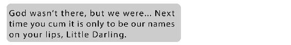 «Бога там не было, но были мы… В следующий раз, когда ты будешь кончать, на твоих устах должны быть только наши имена, Малышка.»