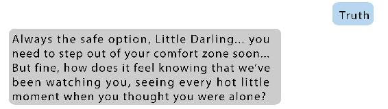 «Как всегда безопасный вариант, Малышка…тебе нужно поскорее выйти из своей зоны комфорта… Но ладно, каково это – знать, что мы наблюдали за тобой в каждый горячий момент, когда ты думала, что ты одна?»