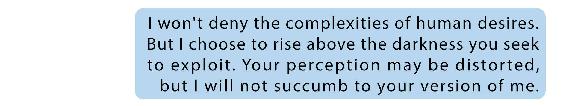 «Я не стану отрицать сложности человеческих желаний. Но я предпочитаю возвышаться над тьмой. Вы стремитесь к эксплуатации. Ваше восприятие может быть искажено, но я не поддамся вашей версии меня.»