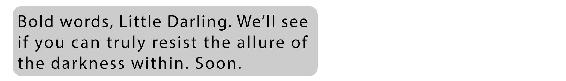 «Смелые слова, Малышка. Посмотрим, сможешь ли ты устоять перед соблазном тьмы внутри себя. Скоро.»