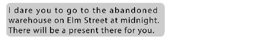«Я осмелюсь предложить тебе отправиться в полночь на заброшенный склад на Элм-Стрит. Там тебя будет ждать подарок.»