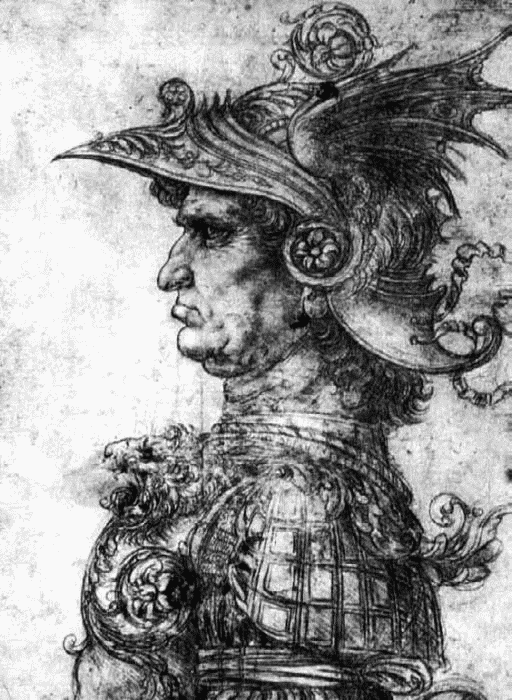 Леонардо да Винчи. Воин в шлеме и доспехах. Серебряный карандаш на кремовой бумаге. Воин изображен в фантастических доспехах (почти что современный стиппанк), а лицо напоминает кондотьера Бартоломео Коллеоне со статуи работы Андреа дель Вероккио. Это ранний рисунок Леонардо