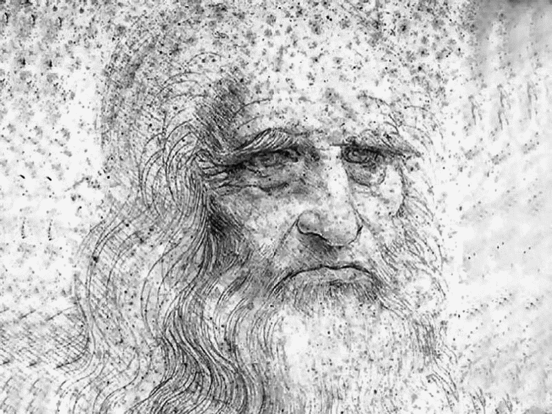Леонардо да Винчи. Автопортрет. Этот рисунок сделан в последние годы жизни Леонардо и выполнен красным мелом (сангиной). «Эта огромная, изборожденная морщинами гора лица, – пишет Кеннет Кларк, автор творческой биографии Мастера, – с благородными бровями, властными, похожими на пещеры глазами и струящимся потоком бороды предвосхищает лица великих людей девятнадцатого века, сохраненные для нас фотографической камерой…»