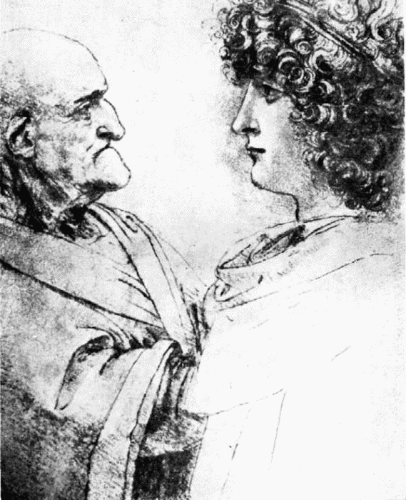 Сохранилось немало рисунков, где на одном листе Леонардо изображает старика и юношу. Их профили обращены друг к другу, и художник как бы сравнивает изуродованное временем усталое лицо беззубого старика (губы плотно сжаты, сама их складка подчеркивает отсутствие зубов) и свежее, улыбчивое, самодовольное лицо юноши. Возможно, Леонардо нарисовал здесь своего ученика Салаино, не блещущего талантами прохвоста, который постоянно обкрадывал своего учителя. Впрочем, Салаино крал не только у него – не пропускал он и чужих кошельков, так что Мастеру приходилось восполнять похищенное «чертенком» из своего кармана.