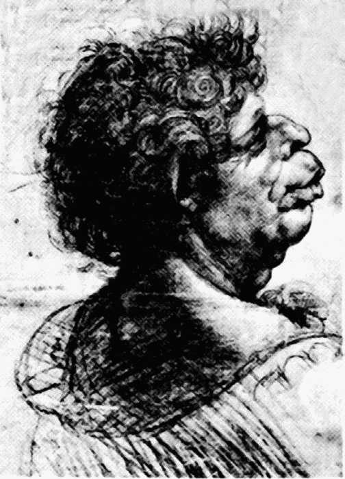 У Леонардо одновременно с тягой к прекрасному была также тяга рисовать безобразные старые лица, на которых годы оставили следы пережитого: все пороки, все выпитые кружки вина, обжорство, лень или хитрость. Однако Леонардо не делал из подобных рисунков карикатуры. Он изображал их с максимальной тщательностью, считая уродство оборотной стороной красоты. Он бывал так счастлив, если встречал на улице «какое-нибудь забавное лицо, все равно бородатое или в ореоле волос, что начинал преследовать человека, столь привлекшего его внимание, и мог заниматься им весь день, стараясь составить о нем ясное представление, а когда возвращался домой, то рисовал его голову так хорошо, как будто человек этот сидел перед ним», – пишет Джорджо Вазари.
