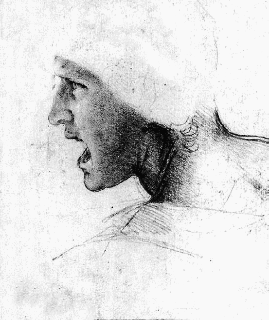 Леонардо да Винчи. Эскиз для фрески «Битва при Ангиари». Рисунок кричащего человека в профиль. Красный мел (сангина)