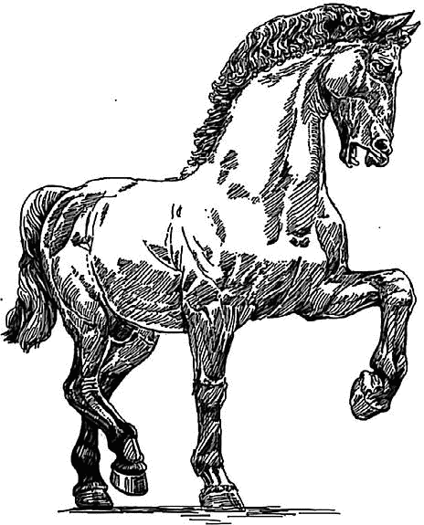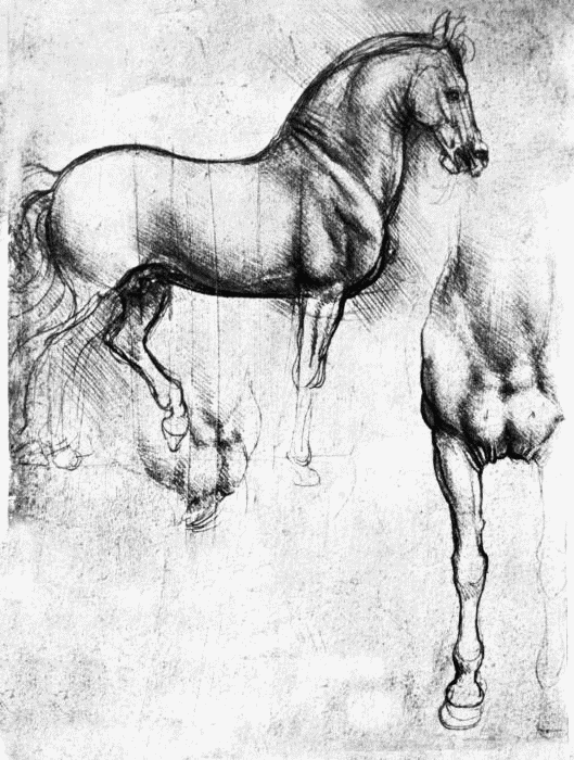 Леонардо задумал своего «Коня» (причем без всадника) высотой более семи метров – никто до него не делал ничего подобного. При этом сначала – если судить по сохранившимся эскизам – он хотел изобразить коня вставшим на дыбы. Задача совершено невероятная для такой огромной статуи. Леонардо пытался создать третью точку опоры, расположив под одной из ног коня поверженного воина, но даже такое решение не могло гарантировать нормального распределения веса между опорами. Во времена Леонардо не было ни одной конной статуи, где бы конь изображался вставшим на дыбы, без подпорок под брюхом животного.
