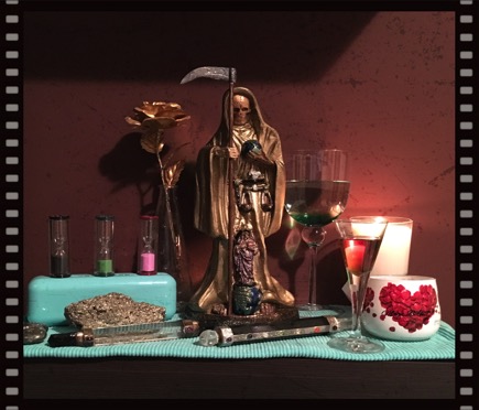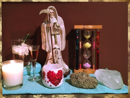 On demande à La Sainte Mort que le temps se déroule en notre faveur pour ce que nous avons besoin, que ce soit rapide ou lent.
