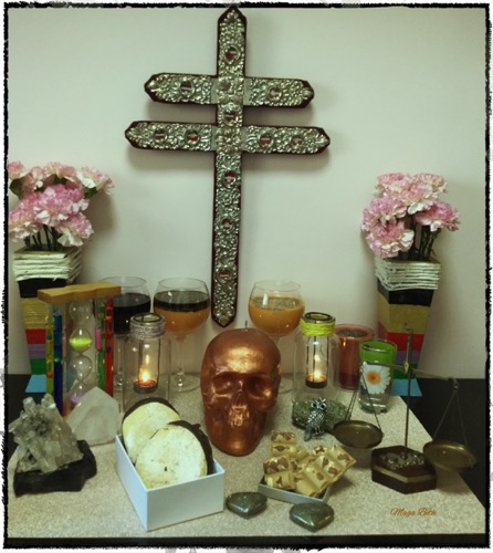 Nous placerons notre Très Sainte Mère sur le dessus et mettrons des bougies de chaque côté, des fleurs et de l'encens. Il est suggéré de mettre un plat en argile, un cendrier et un verre de cristal, qui sont les ustensiles exclusifs de la plus belle mort.