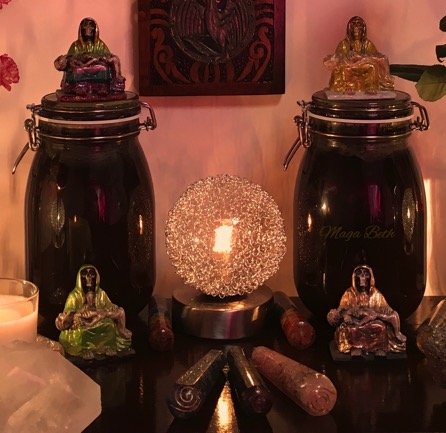Lorsque tout est prêt, il est enveloppé dans un chiffon violet, de préférence, et sera attaché avec un ruban mince, noir ou violet. Il est placé dans le dépôt et recouvert d'un vêtement noir. Nous placerons notre Très Sainte Mère sur le dessus et mettrons des bougies de chaque côté, des fleurs et de l'encens. Il est suggéré de mettre un plat en argile, un cendrier et un verre de cristal, qui sont les ustensiles exclusifs de la plus belle mort.