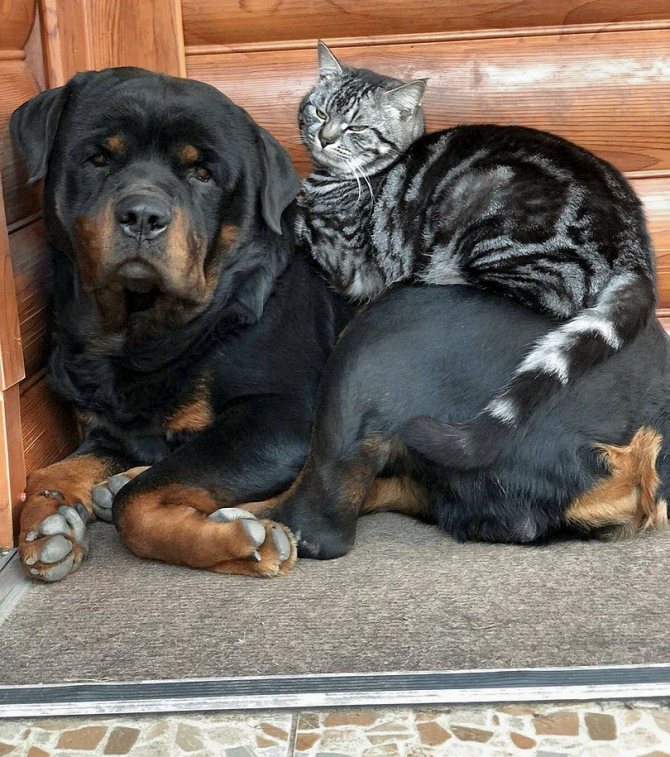 – Так моя собака их вынянчила! Видели как она на нее вызверилась?! – не отступала я, а потом, поскольку моя Сарбона дисциплинированно выполняла команду «сидеть» и уже не пыталась никого съесть, отдав правосудие в мои, хозяйские руки, я, по какому-то наитию, сделала пару шагов в сторону и наклонившись подхватила на руки отирающуюся здесь же двух-цветную кошку. Крепко прихватив ей лапы не долго думая сунула ее попой Сарбоне в морду. Собака обнюхала ничего не понявшую мурлыку и встав усиленно завиляла хвостом так, что аж попа ходуном заходила!