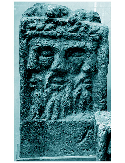 Часть барельефа, изображающего четырехликого бога, предположительно Луга. Обнаружена в 1852 году в Реймсе, Франция (улица Уз-Мюрон).