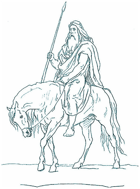Один верхом на коне Слейпнире (здесь изображен с четырьмя ногами, а не с характерными восемью), держа в руках свое копье Гунгнир. Опубликовано в 1895 году.