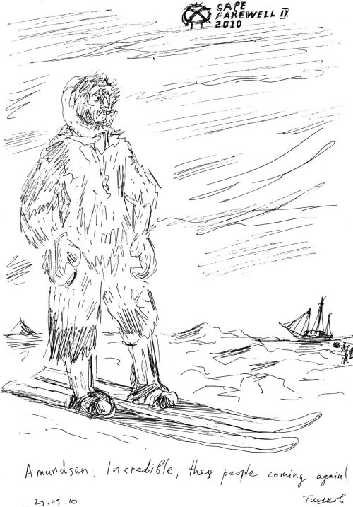 Естественно, многие из нас терялись в догадках – какова цель экспедиции «Саре Farewell»? В чем заключаются наши права и обязанности? Это ведь не простой вояж! Радушное приглашение в Арктику, трехразовое питание, койку надо будет как-то отработать. Но: ни контрактов, ни договоренностей. Что это – подарок небес? Творческий союз?