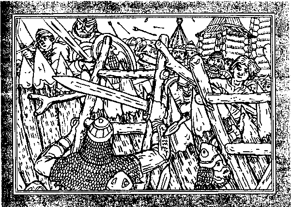 Молча выслушали его предложение волхвы и витязи. Посмотрели сурово на своих врагов и предложили: чтобы сначала христиане позволили уйти из крепости всем женщинам и детям. Согласился на такое условие Путята. И тогда опустились со стен по лестницам дети и беременные женщины. И как только они скрылись в дубраве, раскрылись ворота крепости. И из них в центр христианского войска ударил закованный в непроницаемую сталь прикрытый синими щитами ощетинившийся копьями и поющий гимн Сварогу-победителю воинский клин. Возглавлял это войско сам Добросвет, молниеносно работая двумя мечами, он шёл, рассекая шеренги христианской армии.