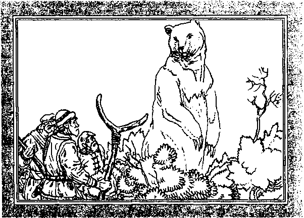Собрав дружину своих лучших воинов, двинулся князь рыскать по чащобам. И вдруг навстречу киевскому государю, ступая по лесу, вышел во всём своём величии сам белый медвежий князь. Он был огромен, как тур, и так силён, что ему была не страшна ни рогатина Владимира, ни любое другое оружие. Увидев косолапого, бросилась на белого медведя-исполина вся княжеская дружина, окружила его. Тогда встал во весь рост князь белый. Воины шли в бой, ощетинившись копьями, рогатинами, мечами и секирами, но огромный зверь своими мощными лапами в один миг перебил и разорвал всех богатырей. И когда добил последнего, бросился на убегающего от него князя. И конец пришёл бы Владимиру, если бы не взмолился он к богу Велесу. Тогда справедливый и благодушный белый князь отпустил государя Киевского. Но, отпуская, обратился к нему человеческим голосом: