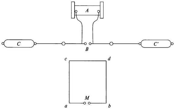 Рис. 24. На верхней части показан вибратор (осциллятор) Герца, а на нижней резонатор. А катушка Румкфорда, В два шарика, между которыми проскакивает искра; С и С два больших проводника, которые заряжаются от катушки. Цепь abcd резонатор Герца, а M два шарика, между которыми можно видеть искорку