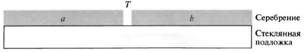 Рис. 25. Резонатор Риги был сделан из стеклянной посеребренной пластинки (как обычное зеркало). Слой серебра на стекле имеет тонкую щель 7, в результате которой получаются две металлические, проводящие части а и b изолированные друг от друга. Когда на такой резонатор по падают электромагнитные волны, в щели Т проскакивает искорка, которую можно увидеть в темноте